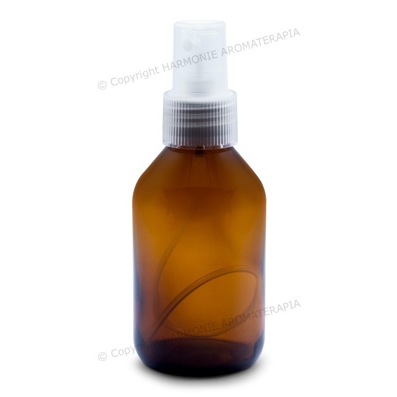 Vidro âmbar 100ml com válvula spray transparente.