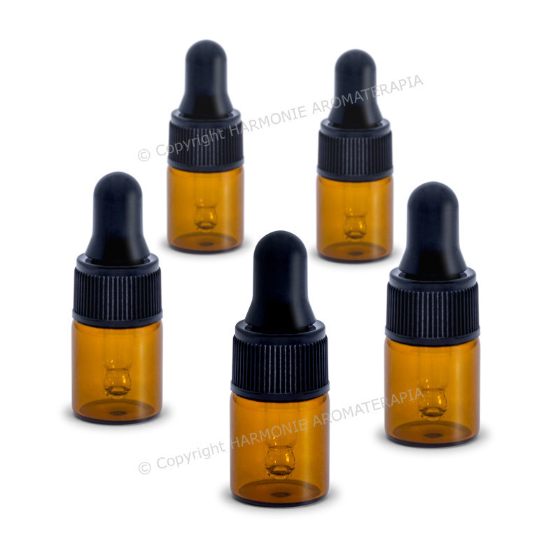 Frasco de 2ml de vidro âmbar, com bulbo de silicone, cânula de vidro, e tampa preta.